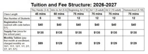 School year classes are still enrolling for some levels. Art 1 is currently closed for registration. If you are a current student, you may re-enroll for the fall using the link sent to you. Fall enrollment opens to new students on May 6, 2026. Classes meet weekly and are not drop-in classes. Choose the appropriate class for your child’s age and sign up! Questions? Call or text (984)234-5565.